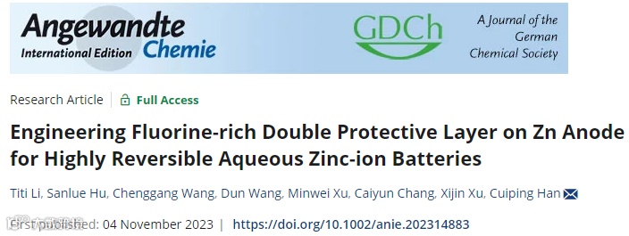 Engineering Fluorine-rich Double Protective Layer on Zn Anode for Highly Reversible Aqueous Zinc-ion Batteries, Angewandte Chemie International Edition, 2023, doi: https://doi.org/10.1002/anie.202314883