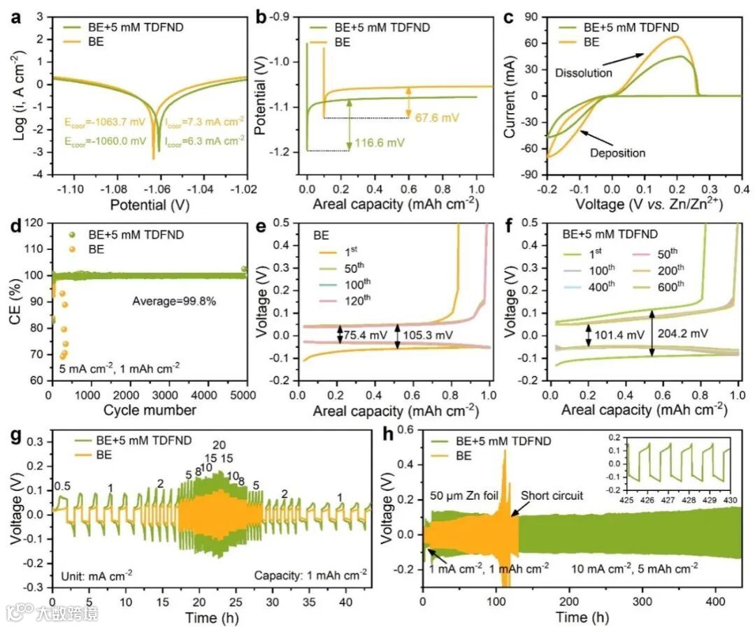 图5. Zn负极在BE+5 mM TDFND电解液中的电化学稳定性和可逆性。a)使用三电极系统,在5 mV s−2下,Zn负极在BE和BE+5 mM TDFND电解液中的线性极化曲线。b)两种电解液中,Zn金属在-150 mV过电位下的恒流安培图。c)Zn||Cu电池的循环伏安曲线。d)Zn||Cu电池在5 mA cm−2和1 mAh cm−2下的库仑效率。e)BE电解液和f)BE+5 mM TDFND电解液中Zn||Cu电池的对应充放电曲线。g)不同电解液中,Zn||Zn对称电池在0.5到20 mA cm−2的电流密度下的倍率性能。h)两种电解液下,Zn||Zn对称电池在10 mA cm−2和5 mAh cm−2的循环性能。