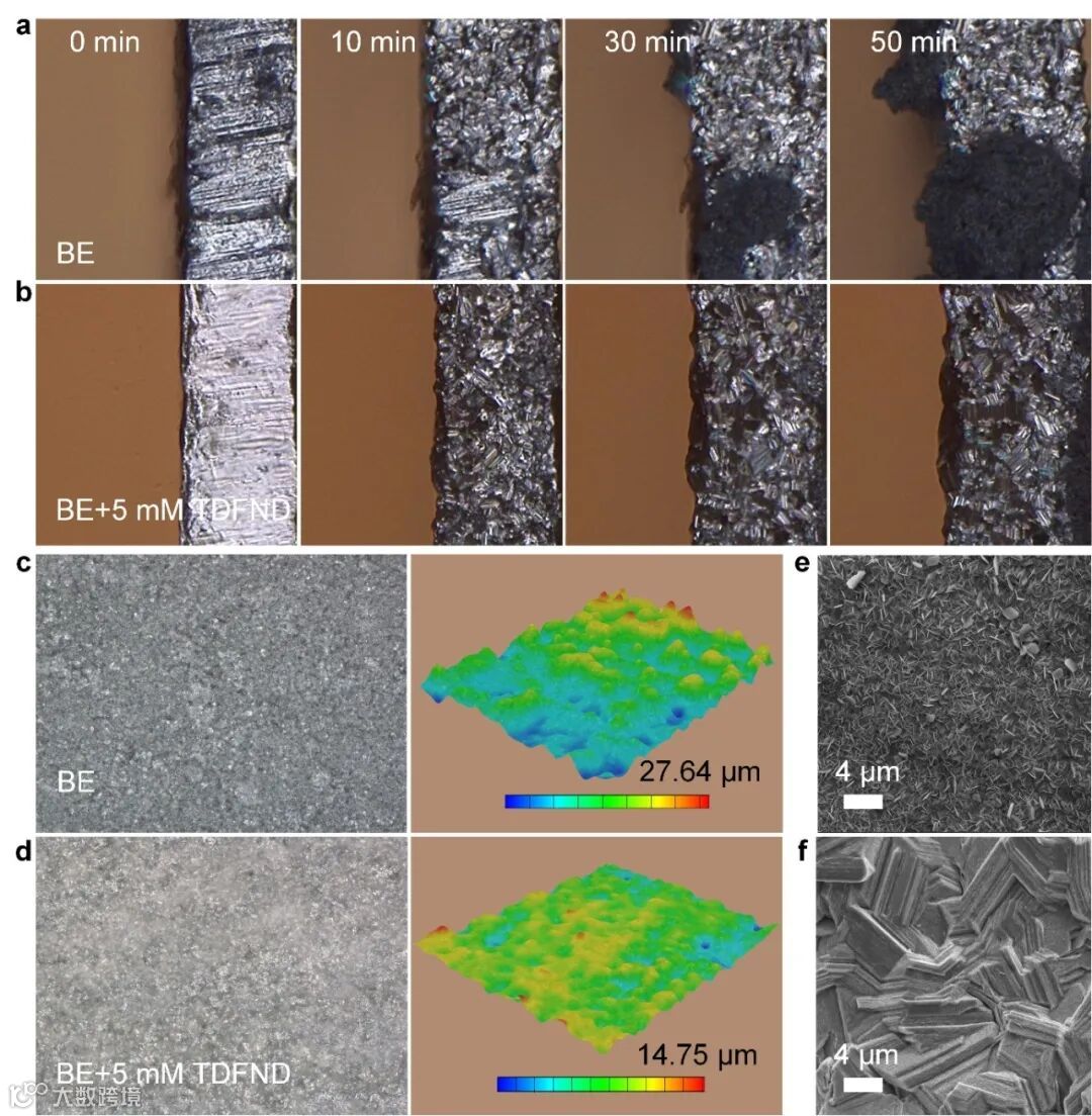 图3. 在BE和BE+5 mM TDFND电解液中的锌沉积形态。a)在BE电解液中,以5 mA cm−2的电流密度进行的Zn电镀过程的原位光学显微镜图像。b)在BE+5 mM TDFND电解液中,以5 mA cm−2的电流密度进行的Zn镀过程的原位光学显微镜图像。c)在BE和d)BE+5 mM TDFND电解液中,经过60分钟Zn沉积后的激光共焦扫描图(CLSM)和相应的3D重建图。e)在BE电解液中,经过5 mA cm−2容量沉积后Zn的SEM图像。f)在BE+5 mM TDFND电解液中,经过5 mA cm−2容量沉积后Zn的SEM图像。