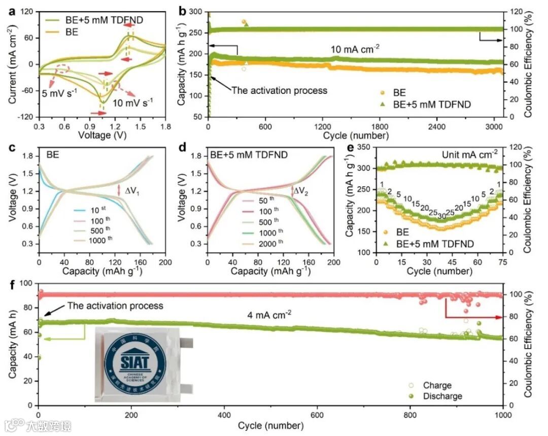 图6. 在BE+5 mM TDFND电解质中的Zn||I2全电池的电化学性能。a)不同电解质下以5 mV s−1和10 mV s−1扫描速率进行的CV曲线。b)在不同电解质中以10 mA cm−2进行20次活化循环后的Zn||I2扣式全电池的循环性能。从循环测试(b)中得到c)BE和d)BE+5 mM TDFND电解质中电池在不同循环次数下的充放电曲线。e)不同电解质下Zn||I2扣式电池的速率性能。f)在BE+5 mM TDFND电解质中以4 mA cm−2操作的Zn||I2软包电池的循环稳定性。插图是软包电池的实物图。