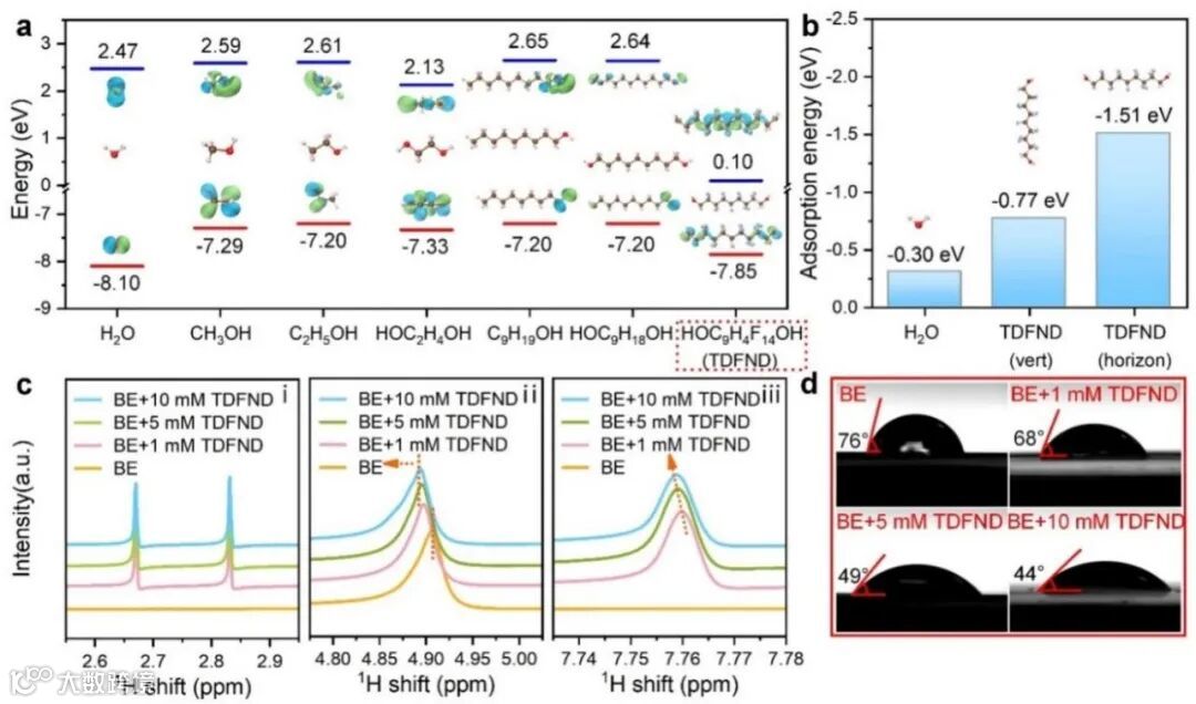 图1. TDFND分子相关的理论计算不同电解液的表征。a)水和不同直链醇分子的LUMO和HOMO能级。b)水和垂直或水平方向的TDFND分子在锌(002)晶面上的吸附能。c)不同组分电解液的1H NMR谱图。d)不同电解液在锌金属电极表面的接触角测试。