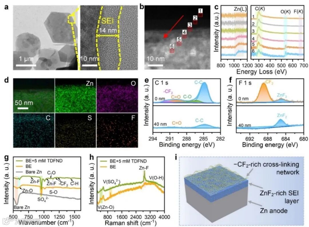 图2. 在BE+5 mM TDFND电解液下沉积锌的形貌和形成SEI的成分分析。a)沉积锌和SEI层的TEM图。b)沉积锌的TEM图及c)对应的EELS谱。d)锌、氧、碳、硫和氟元素的EDS图。循环锌电极不同Ar+刻蚀时间下的e)C 1s和f)F 1s XPS谱图。g)BE和BE+5 mM TDFND电解液中经过20个循环的锌负极上的表面红外和h)拉曼谱图。i)锌负极上富含F的双重保护层的示意图。