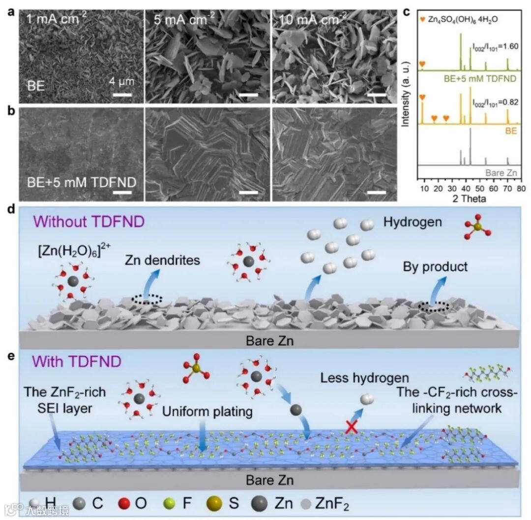 图4. BE电解液和BE+5 mM TDFND电解液中镀锌/剥离行为的比较。a)BE电解液和b)BE+5 mM TDFND电解液中电镀锌的表面形态演变,分别在1、5和10 mA cm−2下,面积容量为1 mAh cm−2。c)在10 mA cm−2和1 mAh cm−2下100个循环后,不同电解液中锌金属的XRD图。d)BE电解液和e)BE+5 mM TDFND电解液中锌沉积的示意图。