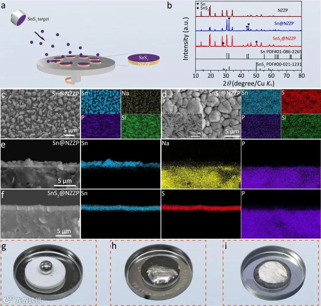 图1.(a)磁控溅射制备SnS2@NZZP示意图。(b)NZZP、Sn@NZZP和SnS2@NZZP表面XRD谱图。(c)Sn@NZZP和(d)SnS2@NZZP表面SEM图像和元素分布。(e)Sn@NZZP和(f)SnS2@NZZP截面形貌和元素分布。熔融金属钠在(g)NZZP、(h)Sn@NZZP和(i)SnS2@NZZP片上润湿行为比较。