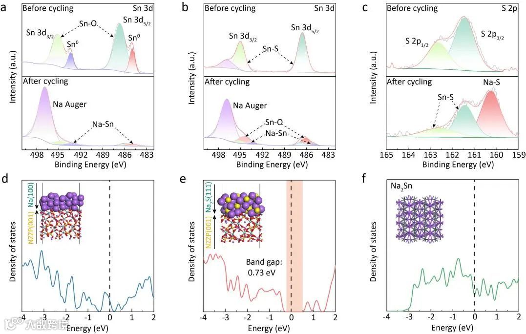 图3.(a)Na/Sn@NZZP界面循环前后的Sn 3d XPS光谱。(b)Na/SnS2@NZZP界面循环前后的Sn 3d和(c)S 2p XPS光谱。(d)Na/NZZP,(e)Na2S/NZZP,(f)Na─Sn合金的态密度(费米能级被移到了零)。