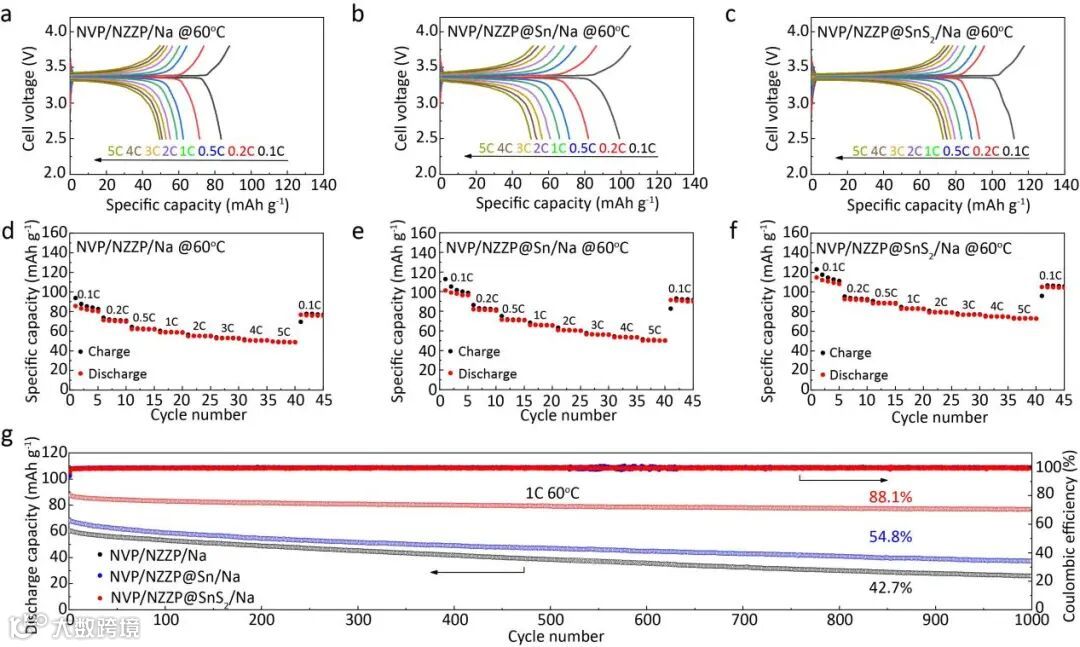 图5.(a)Na3V2(PO4)3/NZZP/Na,(b)Na3V2(PO4)3/NZZP@Sn/Na,(c)Na3V2(PO4)3/NZZP@SnS2/Na固态电池在60 ℃不同电流密度下的充放电曲线。(d)Na3V2(PO4)3/NZZP/Na,(e)Na3V2(PO4)3/NZZP@Sn/Na,(f)Na3V2(PO4)3/NZZP@SnS2/Na固态电池在60 ℃下的倍率性能。(g)对应的电池在60 ℃,1 C倍率下循环性能。
