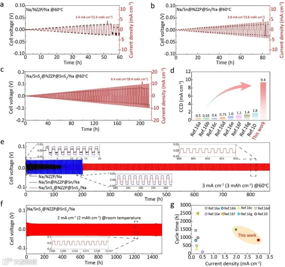 图2.(a)NZZP,(b)Sn@NZZP和(c)SnS2@NZZP的钠对称电池在60 ℃下极限电流密度测试。(d)文献中不同策略修饰Na3Zr2Si2PO12基固体电解质的CCD值比较。(e)NZZP,Sn@NZZP和SnS2@NZZP的对称电池在60 ℃,3.0 mA cm-2的电流密度下进行恒流充放电。(f)Na/SnS2@NZZP@SnS2/Na对称电池在室温,2.0 mA cm-2的电流密度下进行恒流充放电。(g)SnS2@NZZP与文献报道的Na3Zr2PO12基电池的循环稳定性对比。