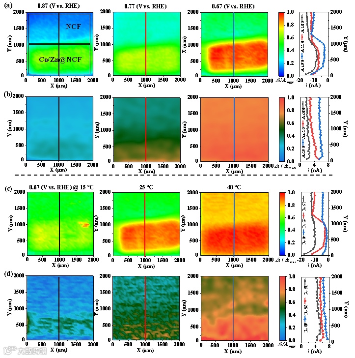 图3. 温控SECM结构示意图及归一化的SECM图像。(a-b)不通电压下催化剂的原位ORR活性与选择性。(c-d)不同温度下催化剂薄膜催化剂的局部ORR活性与选择性。