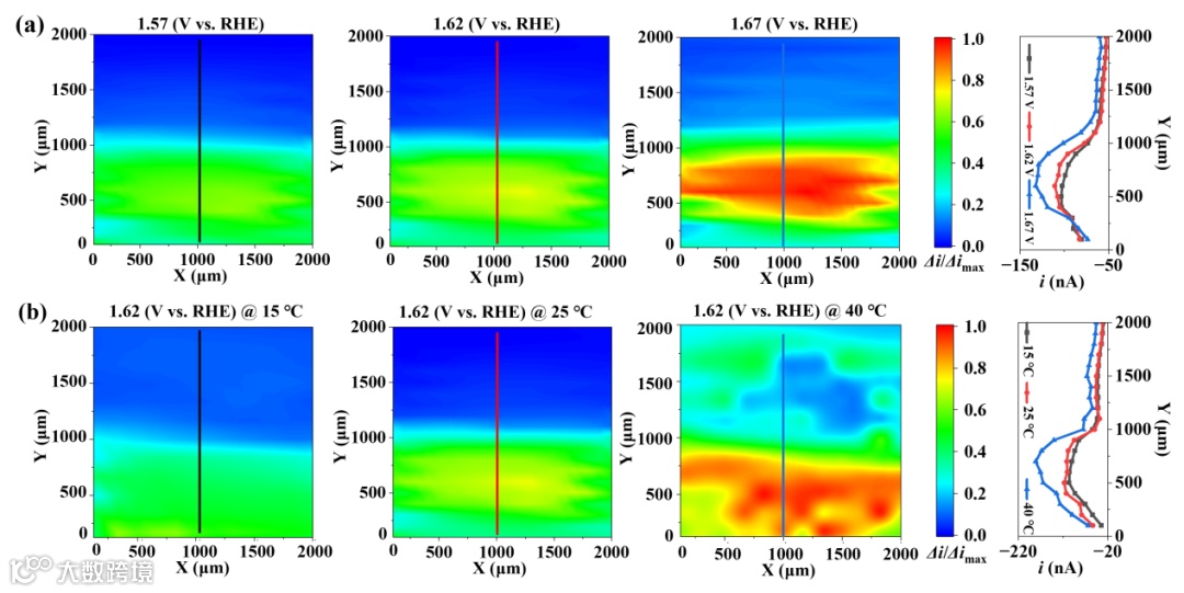 图4. (a)不同电压和(b)温度下催化剂的局部OER活性.