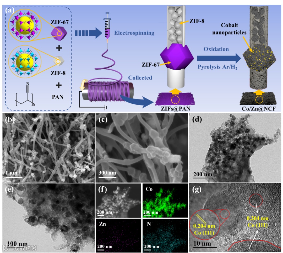 图1. 柔性Co/Zn@NCF纳米纤维薄膜催化剂的合成方法及结构表征。
