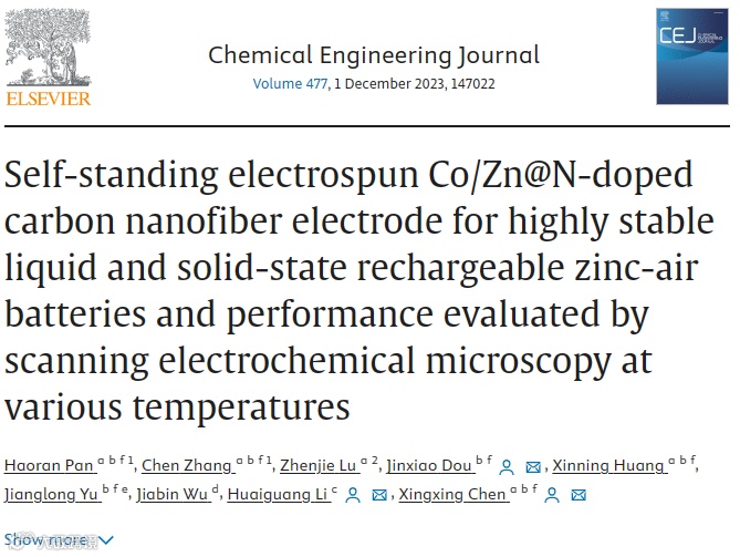 近日,辽宁科技大学陈星星教授,窦金孝副教授与香港中文大学(深圳)李怀光助理教授合作,在国际知名期刊Chemical Engineering Journal上发表题为“Self-standing electrospun Co/Zn@N-doped carbon nanofiber electrode for highly stable liquid and solid-state rechargeable zinc-air batteries and performance evaluated by scanning electrochemical microscopy at various temperatures”的文章。一种自支撑的N掺杂Co/Zn碳纳米纤维膜(Co/Zn@NCF)具有卓越的电催化氧反应活性和耐久性。基于Co/Zn@NCF催化剂构筑的液态ZABs表现出超过666小时的优异充放电循环寿命,充电/放电电压差为0.64 V,电压效率为66%。用Co/Zn@NCF构筑的柔性固态ZAB能够在不同的弯曲角度下稳定地充电和放电。该工作同时利用温控扫描电化学显微镜(SECM)探究了Co/Zn@NCF膜电极在不同工作温度(15, 25,40oC)条件下的微区局部电催化氧反应活性和选择性。