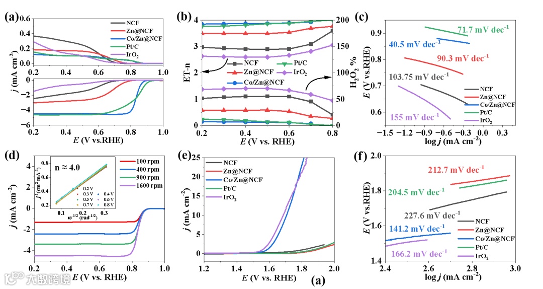 图2 在O2饱和的0.1 M KOH 电解液中下获得的(a-d) ORR和(e-f) OER性能。