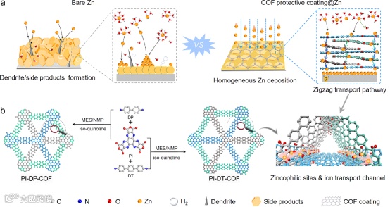 图1. 锯齿状COFs酸酐作为负极保护层的优点示意图。(a)在纯锌和酸酐COFs@Zn负极上的锌沉积行为示意图。(b)PI分别与DT和DP单体缩合反应合成的PI-DT-COF和PT-DP-COF及其结构。