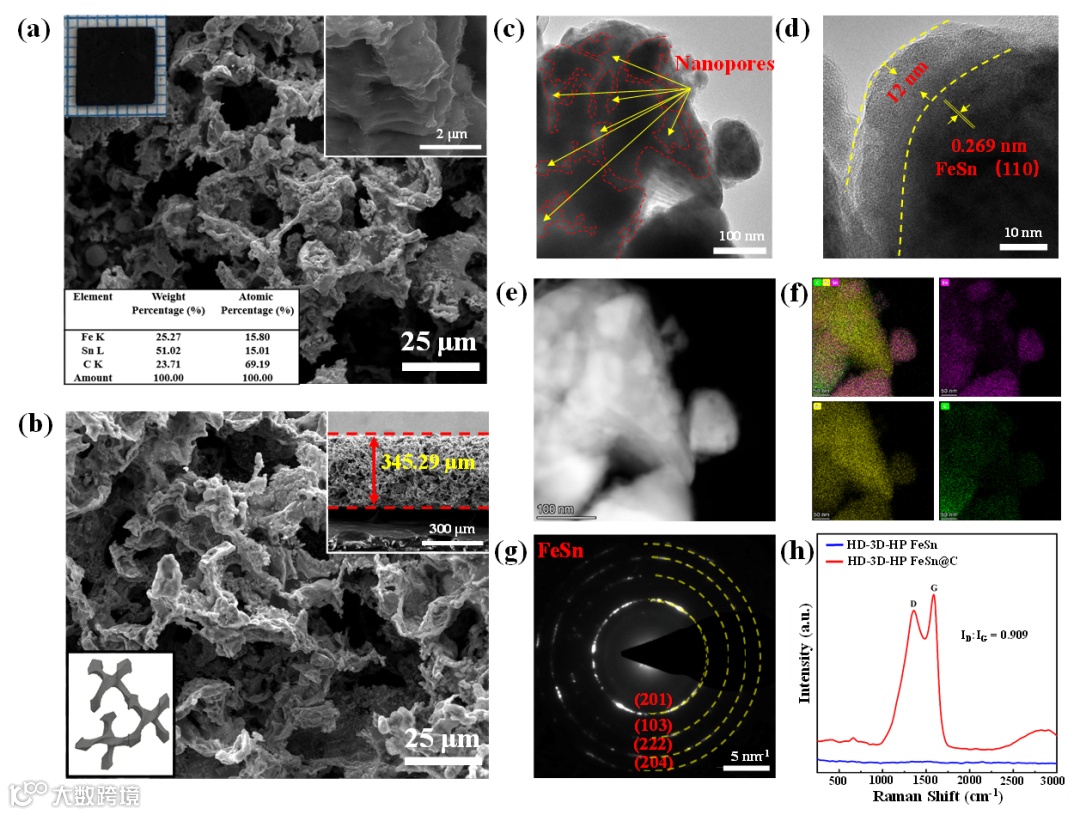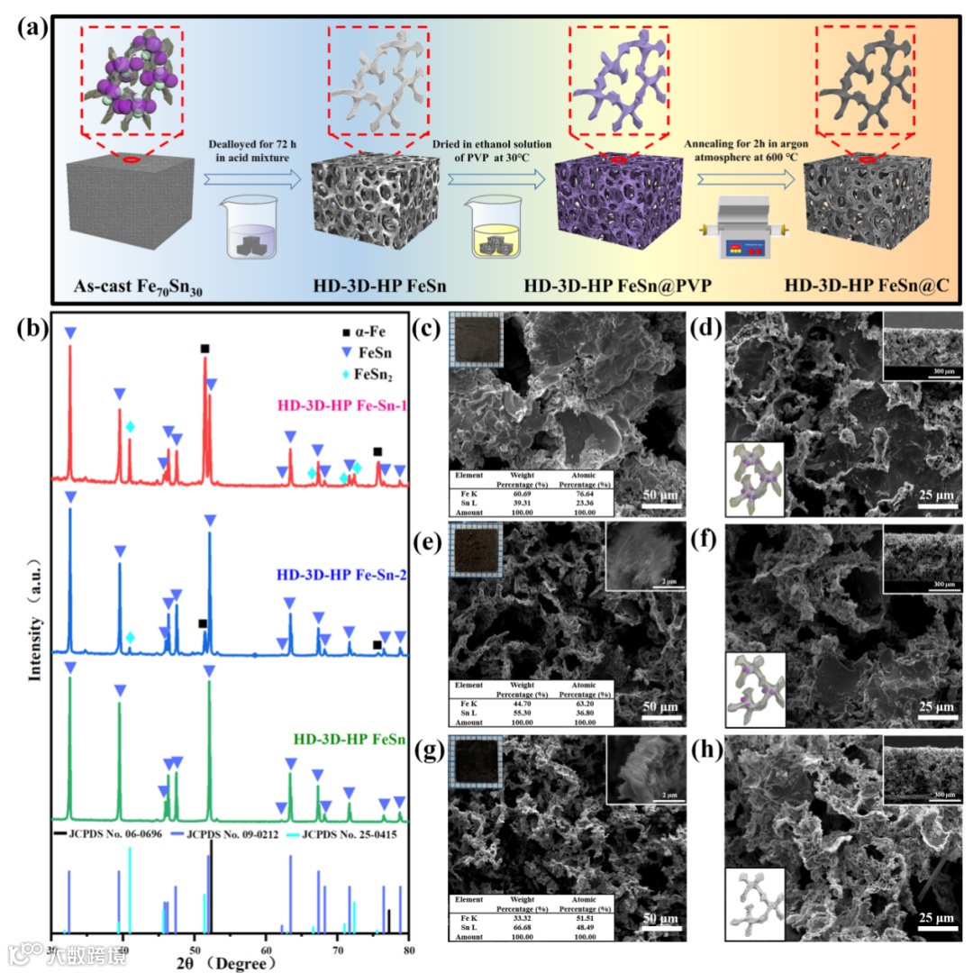 图3. HD-3D-HPFeSn@C负极的形貌与结构表征