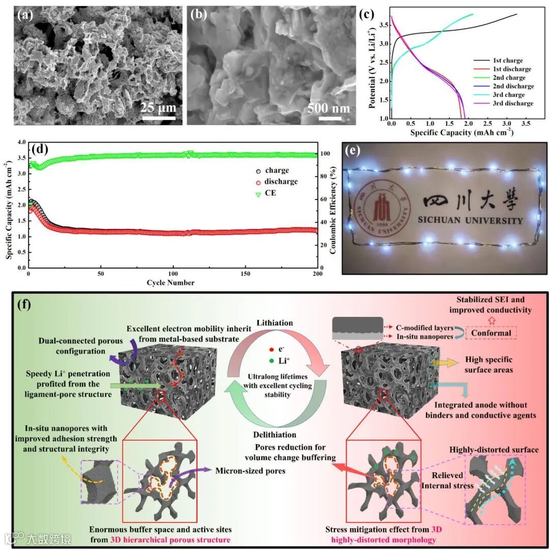锡是一种极具潜力的锂离子电池负极材料,当在嵌锂形成Li4.4Sn合金时,其容量可高达994 mAh g−1。然而,此过程会产生很大的体积变化(约260%),从而在材料内部产生机械应力,进而导致电接触不良和显着的容量衰减。为克服上述困难,对电极进行特定的形态修饰是一种有效的策略。与传统平面结构电极相比,3D多孔电极具有更大的比表面积和更多的内部微空间,这有助于改善活性材料负载量,并有助于适应锂化-脱锂过程中结构的体积膨胀。然而,仍无法满足长期稳定循环的需求,有待进一步优化缓解活性材料锂化-脱锂过程产生的内应力。