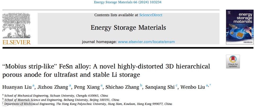 近日,四川大学刘文博教授团队通过脱合金和溶胶-凝胶热解法构建了新型高扭曲的3D分层多孔“莫比乌斯环”状FeSn电极(HD-3D-HPFeSn@C),不仅缓解了在充放电过程中的巨大体积膨胀,也有效改善了Li+传质并提高了电极整体的导电性,从而获得了优异的储锂性能,为下一代高性能锂离子电池负极提供了一种新颖且通用的设计理念。相关研究成果以“Mobius strip-like” FeSn alloy: A novel highly-distorted 3D hierarchical porous anode for ultrafast and stable Li storage”为题发表于材料科学领域国际能源顶级期刊《Energy Storage Materials》(IF: 20.4),文章第一作者为刘焕岩助理研究员。
