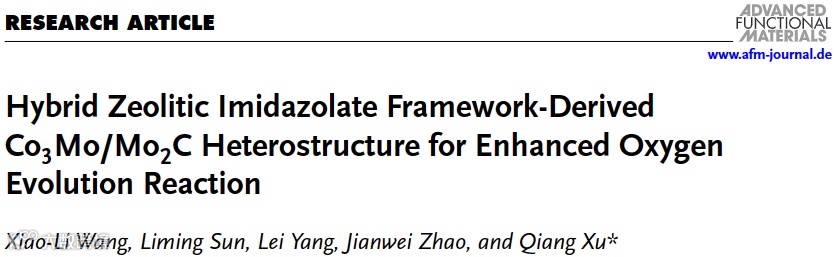 基于此,南方科技大学徐强团队在知名国际期刊Advanced Functional Materials上发表题为“Hybrid Zeolitic Imidazolate Framework-Derived Co3Mo/Mo2C Heterostructure for Enhanced Oxygen Evolution Reaction”的研究论文。