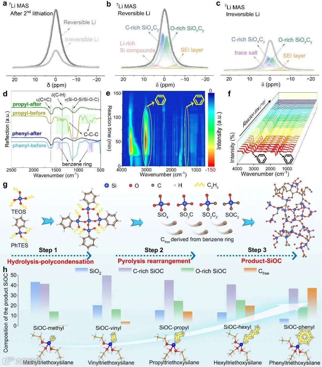 通过7Li-MAS-NMR表征了较高Cfree含量的SiOC含有约65%的完全可逆Li物种,这为提高Li+在SiOC中的存储性能提供了保障。通过原位漫反射红外傅里叶变换光谱证实了SiOC中Cfree的含量与硅氧烷前驱体中R基官能团的自衍生效应密切相关,并通过一系列平行实验,证实了硅氧烷中R基官能团的碳链长度越长,自衍生效应产生的Cfree含量越高,且不饱和R基官能团自衍生效应产生的碳自由基更容易形成Cfree并存在于SiOC结构中。