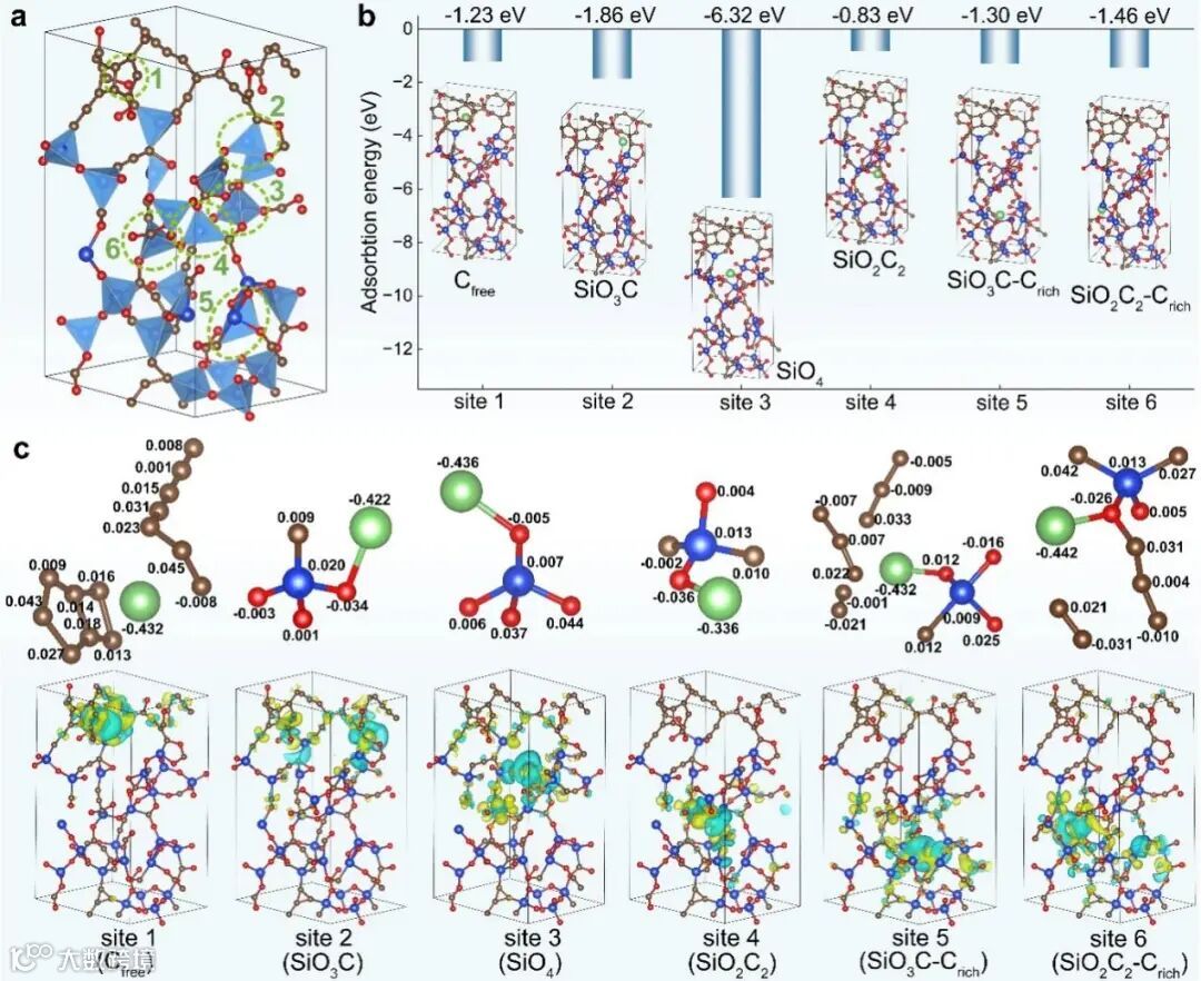 此外,通过DFT计算表明SiOC中各组分对Li的吸附能力为:SiO4(-6.32 eV)>SiO3C (-1.86 eV)>Cfree域 (-1.23 eV)> SiO2C2 (-0.83 eV),证实了Cfree增强了可逆结构单元SiO2C2对Li的吸附能力。这些研究结果为阐明SiOC的储锂机理提供了证据,对推动SiOC储能材料的发展具有重要的意义。