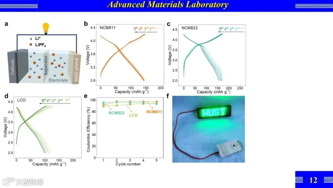 NCM811/SiOC、NCM622/SiOC和LCO/SiOC全电池的首圈库仑效率分别为92%、96%和89%。另外,组装好的NCM811/SiOC全电池可以轻易地点亮商用LED标牌,从而充分展示了所制备的SiOC-苯基负极材料的实际应用潜力。