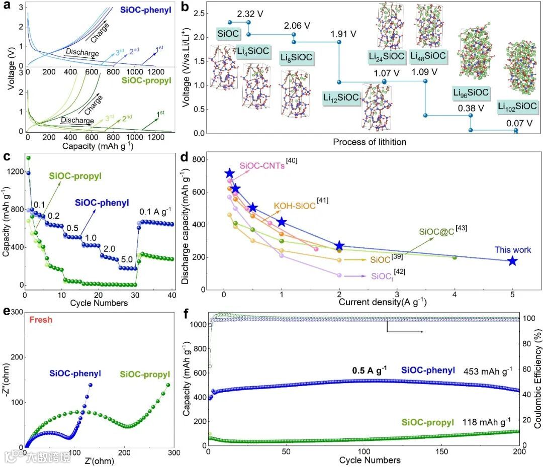 另外,以Cfree含量分别为14.3 wt%和37.5 wt%的SiOC-丙基和SiOC-苯基作为负极材料,以评估不同Cfree含量对SiOC储锂能力的影响。结果表明,SiOC中Cfree含量越高,越有利于Si-O-C四面体中导电网络的形成。这种导电网络有助于电子/离子快速进入储锂位点,确保储锂位点的综合利用。在0.5 A g−1的电流密度下循环200次后,SiOC-苯基负极材料的比容量为453 mAh g−1。此外,所制备的SiOC-苯基负极的倍率性能和循环性能均优于目前报道的大多数SiOC负极。