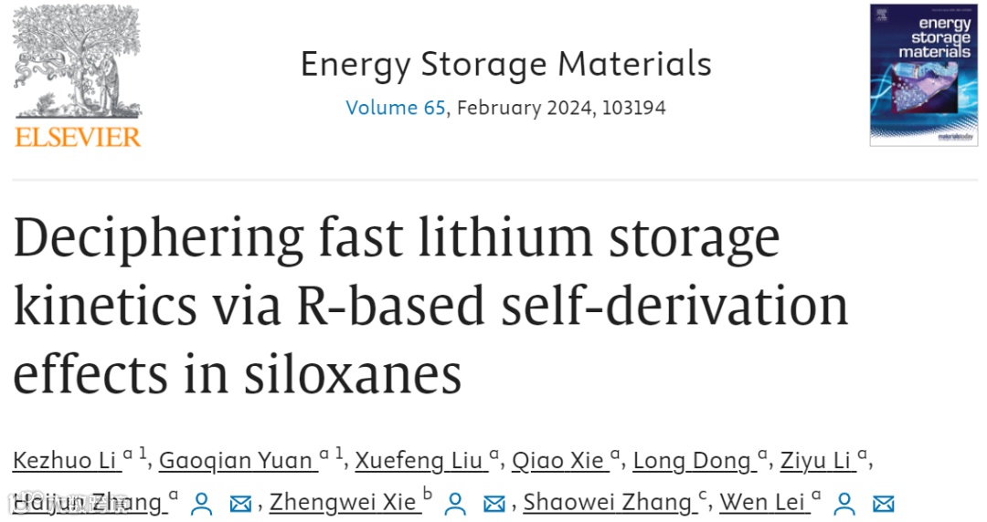Energy Storage Materials上发表题为“Deciphering Fast Lithium Storage Kinetics via R-Based Self-Derivation Effects in Siloxanes, 2024, 65, 103194.