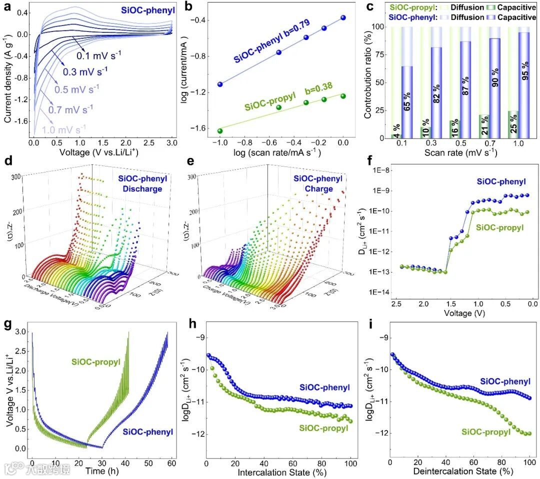 CV测试证实了SiOC-苯基阳极的赝电容贡献远大于SiOC-丙基负极。原位阻抗测试表明SiOC-苯基负极的电荷转移电阻小于SiOC-丙基负极。另外,SiOC-苯基负极在锂化/脱锂过程中的DLi+在10−9~10−11范围内,高于SiOC-丙基负极,表明增加Cfree的含量有利于构建锂储存过程中电子/离子迁移“高速公路”,进而有效提升SiOC的储锂动力学。