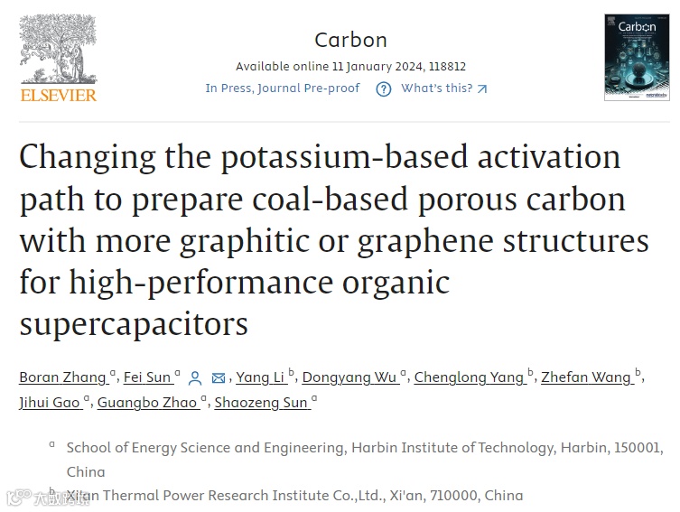 近日,来自哈尔滨工业大学的孙飞教授等在国际知名期刊Carbon上发表题为“Changing the potassium-based activation path to prepare coal-based porous carbon with more graphitic or graphene structures for high-performance organic supercapacitors”的观点文章。该文章以大储量准东煤作为碳源,研究了在不同钾基活化路径下对石墨化过程的调控作用。通过Raman mapping等多种手段证明,相比于直接活化,引入预碳化后能够轻松促进钾基活化中石墨化结构的形成,并结合中间体结构表征提出了一种有关液相反应介质加速石墨化过程的新成碳路径和机制。通过精心设计碳材料的孔隙率和石墨化度,所构建的有机系超级电容器具有高达31.6 Wh kg−1的能量密度以及11.3 kW kg−1的功率密度,同时这种材料能够适用于各类型的储能场景,展现出卓越的电化学性能。