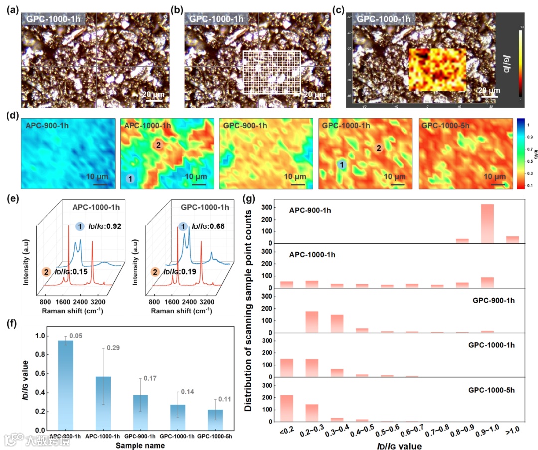 通过Raman mapping准确研究了钾基活化过程中APCs和GPCs非晶态和石墨化结构的分布情况。APCs和GPCs的光学图像中存在明暗、大小不一的光斑,这些光斑具有不同的ID/IG值,表明样品中存在明显的结晶性差异。APCs的Raman mapping图像呈现大面积的蓝色,而GPCs以大面积暖色区域为主,并且随着活化深度的增加逐渐转变为深红色,表明GPCs发生了更深的石墨化。由于单一样本点的结构信息无法全面揭示材料的石墨化度,通过统计学方法计算了各样品ID/IG的平均值和标准差,得出的更小计算结果进一步证实KOH活化过程中碳结构的石墨化度和晶态碳分布均匀性可以通过改变热转化路径来有效提升和改善。
