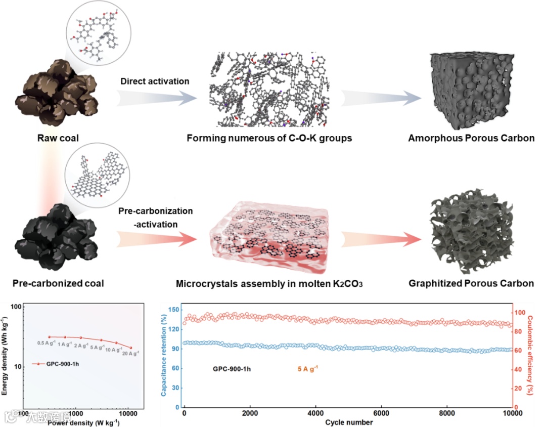改变钾基活化路径制备具有更多石墨或石墨烯结构的煤基多孔碳用于高性能有机超级电容器