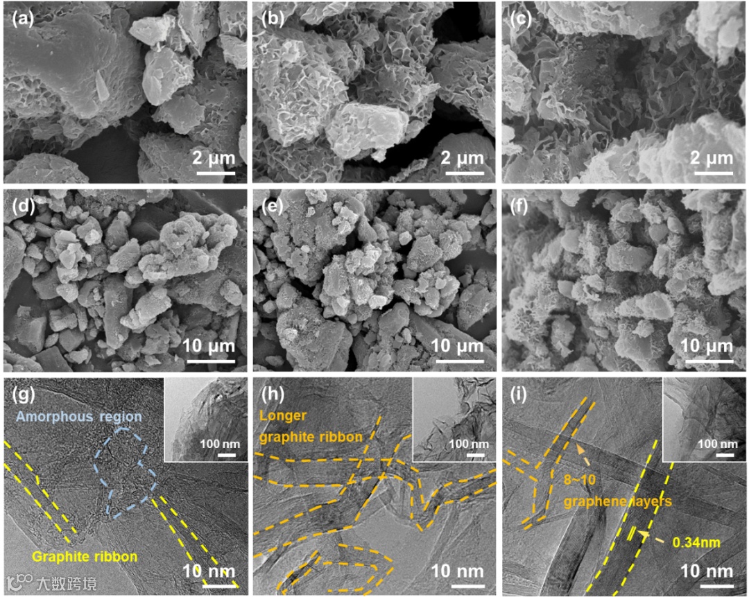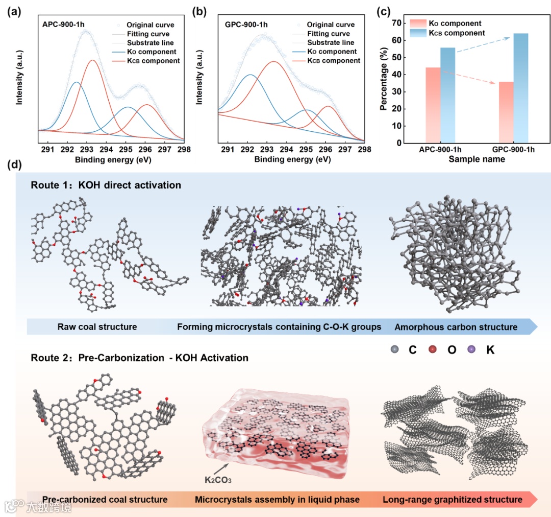 利用XPS检测了典型中间产物中钾物种的存在形式。在KOH直接活化的产物中,钾原子往往以K-O基团(Ko)形式存在;引入预碳化使KOH活化路径发生改变,反应中的钾化合物更多以熔融K2CO3形式存在。因此,提出的关于钾基活化成碳路径包括:在直接活化过程中钾原子会自发地与前体中的活性氧自由基结合成C-O-K,附着在碳碎片边缘阻碍石墨微晶组装,材料表现出无定形特性。相比之下,预碳化的引入促进了碳前体中初始微晶结构的发展,并能够充分形成以熔融K2CO3介导的液相反应介质,从而加速了更成熟碳微晶的拼接和整个石墨化过程。