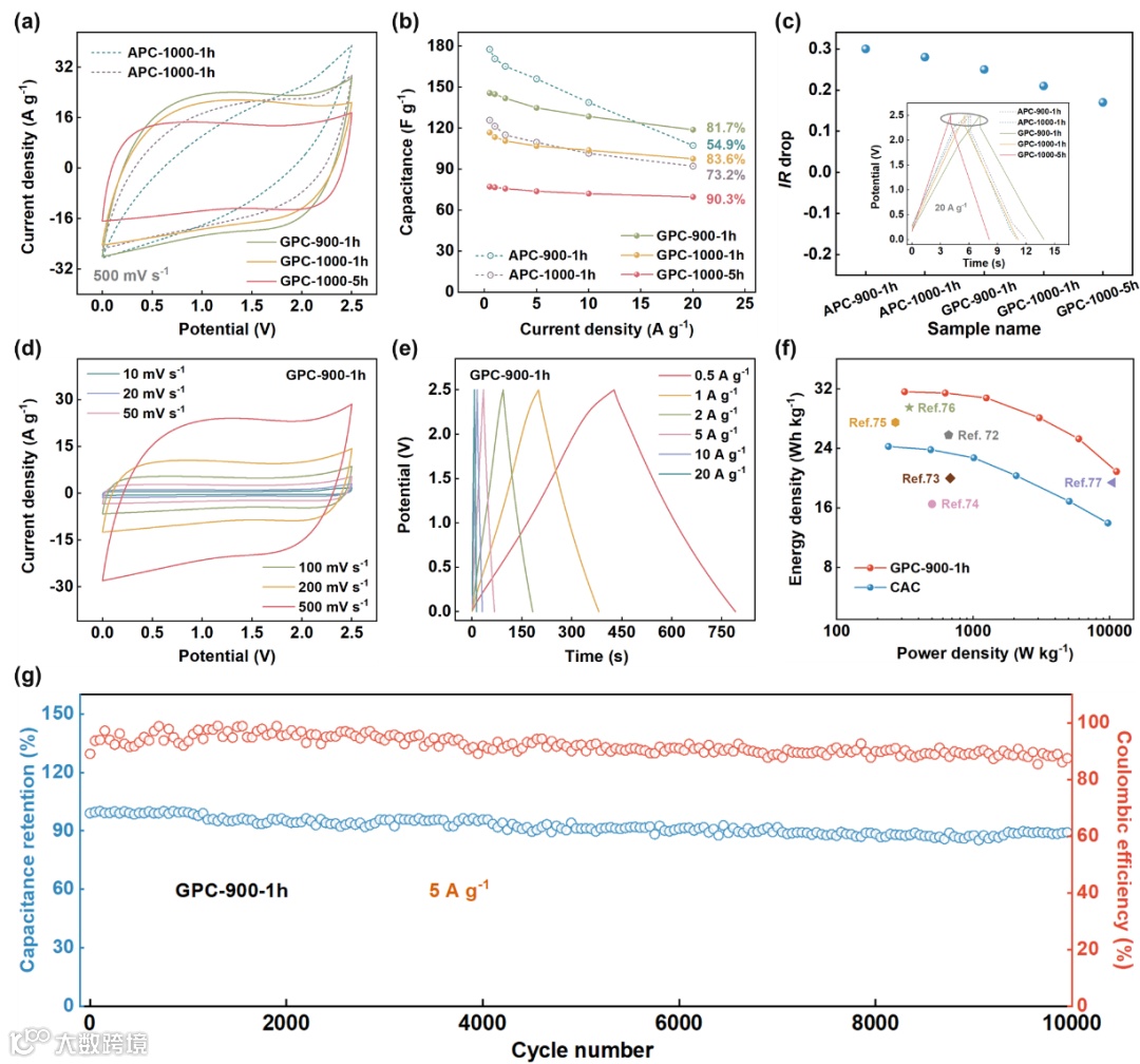 通过精心设计碳材料的多尺度结构,构建出的有机系超级电容器具有优异的电容行为和良好的电化学性能。在1 mol L−1的TEABF4电解液中,GPC-900-1h以其多孔和石墨化特性在作为电极材料时表现出145.7 F g−1的高比电容和81.7%的高倍率性能,在0.5 A g−1的电流密度下可以获得31.6 Wh kg−1的高能量密度。此外,经10000次循环后,器件的电容保留率约为90%,展现出出色的长循环稳定性。