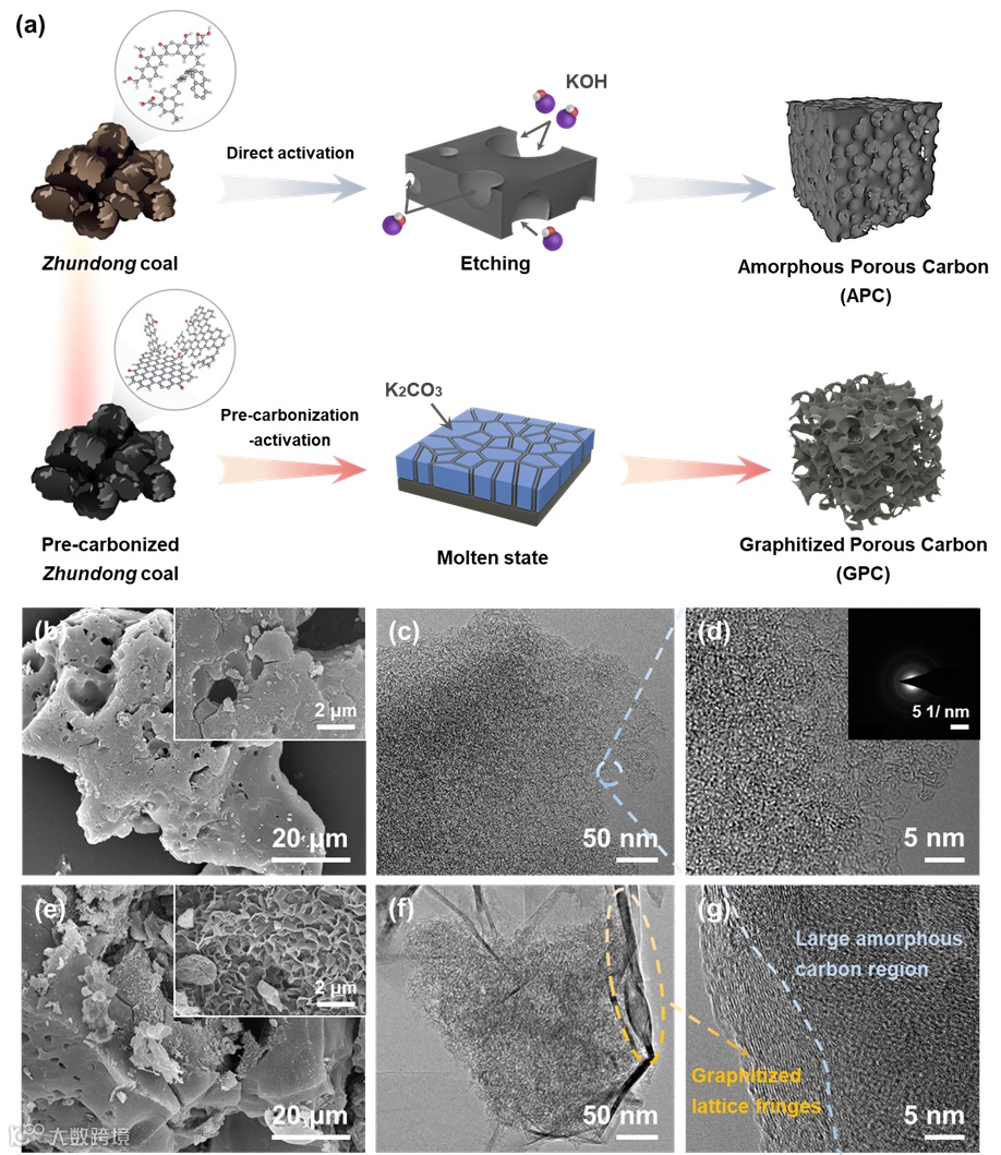 要点一:改变钾基活化路径制备具有高石墨化度的多孔碳采用两种不同的KOH活化路径将准东煤转变为无定形多孔碳和石墨化多孔碳。