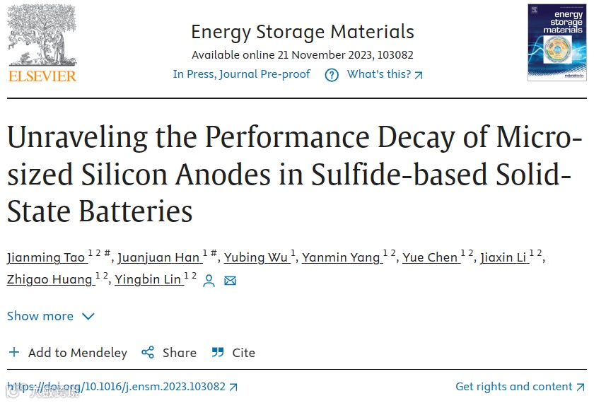 近日,来自福建师范大学的林应斌教授团队在国际知名期刊Energy Storage Materials上发表题为“Unraveling the Performance Decay of Micro-sized Silicon Anodes in Sulfide-based Solid-State Batteries”的研究论文。该论文系统探究了硫化物固态电池中微米硅负极的储锂和失效机制,从实验和模型双维度上揭示了不同负载量和不同外加压力下硅的锂化动力学、形态演化和电池性能衰减的机制。