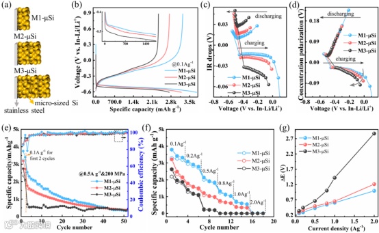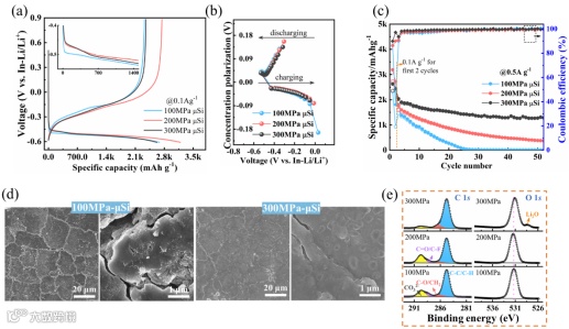 通过对比在100MPa、200MPa、300MPa和更高外加压力微米硅电极的充放电曲线、动态EIS、GITT、SEM以及XPS,可以发现外加压力对于锂离子扩散的影响极其小,其主要作用是在于降低Von Mises应力,降低开裂程度,保证电子/离子输运,从而构建平衡的Li+浓度梯度和电化学电位,并减少析锂和界面副反应的发生。低的堆叠压力不能保障电极在长期的循环中应力的积累,因为其会出现持续性的破碎并致使离子和电子传输通路的减少以降低电池的比容量。而在高达300MPa下工作的电极则呈现出更致密的表面形貌且表面鼓包状态也较好,表明其均匀的锂化和锂化行为。在300 MPa下工作的电池在0.5A/g下循环50次比容量仍高达1283.0 mAh/g,容量保持率为67.2%。
