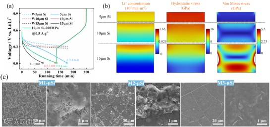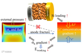 近年来,研究者们尝试通过增加堆叠压力、预锂化、添加硬碳、采用硅/碳纤维等方法来增强硅负极的循环性能。尽管这些改进策略可以较好的增强电极的循环性能,但通常是以牺牲能量密度为代价的。要想保证电极在循环过程中始终保持良好的电子/离子接触,提高堆叠压力往往是必要的。但从实际应用角度出发,低于1 MPa的堆叠压力方才能应用于软包电池中。因而如何减少外加堆叠压力但又能保障硅负极的稳定循环是其应用的一大挑战。硅体积变化引起的应力主要源于锂离子浓度的波动。由于电子导电性和离子扩散的限制,厚的硅负极中必然存在锂离子的浓度梯度。这会导致应力分布不均衡,并致使电极易于屈服或开裂。同时,理论上预期的不同负载下硅负极所需的外加压力的上限会有所不同。为了推进含硅固态电池的发展,建立硅负极中离子输运、应力演变、外部压力和性能之间的明确关系是至关重要并且迫切需要的。但遗憾的是,迄今为止关于这方面的报道还很少。