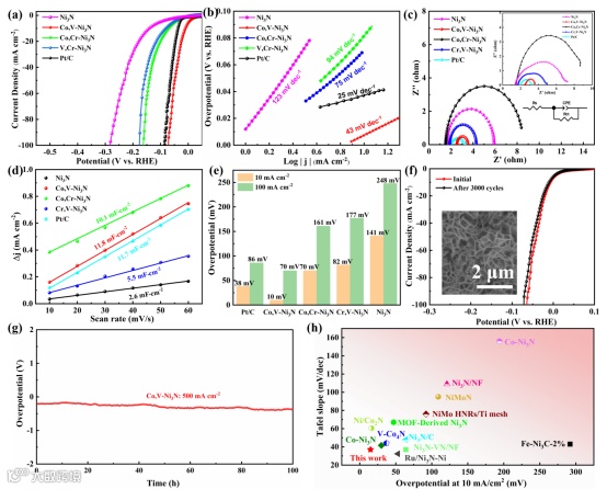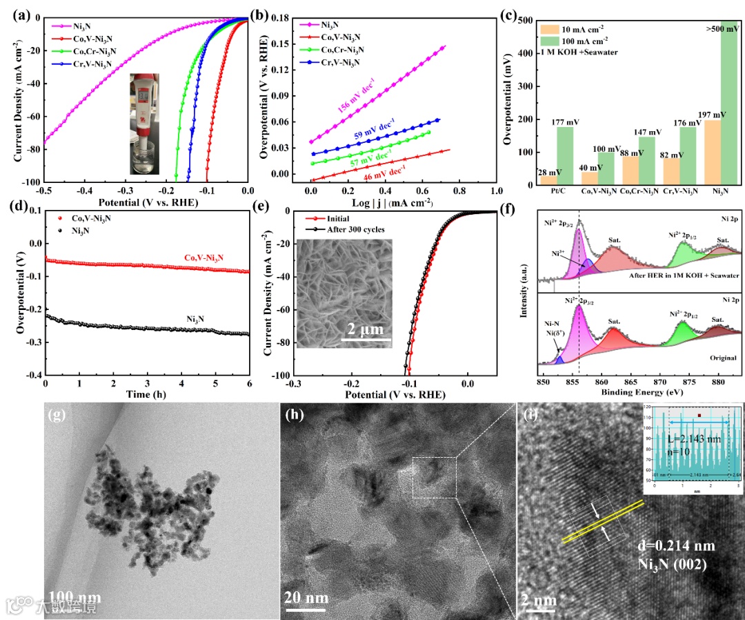所制备的催化剂展现出可与贵金属催化剂媲美的析氢活性。Co,V-Ni3N在碱性电解质和碱性海水中分别只需要 10 mV 和 41 mV 的电压,就能达到 10 mA cm-2 的电流密度。此外,它还能在 500 mA cm-2 的工业大电流密度下长期稳定运行。
