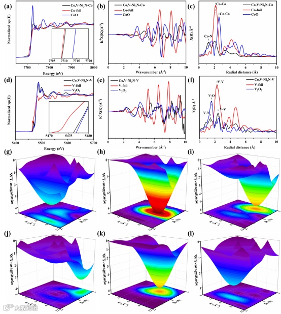 XPS图谱中,Ni 2p和N 1s光谱中峰值位置的移动表明 Ni 周围的电子转移到了N,这反过来又导致 Ni+ 失去电子并转化为 Ni2+。在 HER 过程中,Ni3N 的活性位点是 Ni 阳离子,Ni2+ 在加速 HER 的动力学速率方面发挥了作用。因此,可以认为掺杂促使催化剂活性位点暴露,进而提高了 HER 活性。此外,掺杂过渡金属后,Co、V-Ni3N 的信号在 EPR 光谱中明显增强和变宽,表明其缺陷浓度增加。UPS图谱中,Co,V-Ni3N 的 eΦ 最低。eΦ 的降低促进了催化剂内部的电子转移,从而提高了 HER 活性,这与理论计算结果一致。Co,V-Ni3N 的 EV 值最大,价带最大值的增加表明过渡金属掺杂后电催化剂的 ΔG 变小,从而促进了中间产物和 H2 的解吸。进一步采用同步辐射测试证明了钴和钒的成功掺杂以及配位环境。