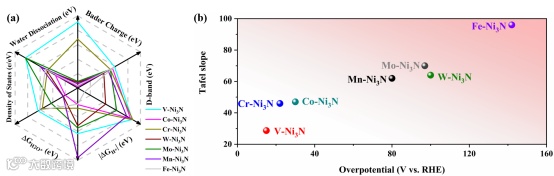 将该策略推广到不同单一过渡金属掺杂Ni3N的体系中,发现与其他单一过渡金属掺杂的Ni3N相比,V-Ni3N表现出优异的 ΔGH*、水解离能和导电性。在综合评估中,V-Ni3N 在雷达图中的面积最大,这表明它具有理论上最佳的HER催化活性。而在电化学测试中,V-Ni3N 的HER过电位最低,动力学也最优。这充分说明该评价体系是合理而有意义的,有助于我们高效地筛选出优秀的析氢催化剂,加速下一代制氢催化剂的开发。