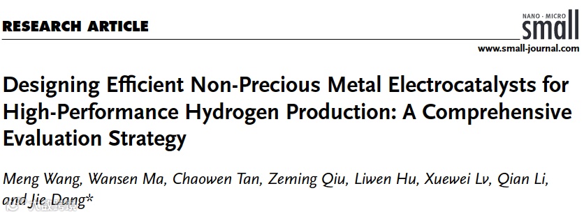 近日,来自重庆大学的党杰教授、吕学伟教授等人,在国际知名期刊SMALL上发表题为“Designing Efficient Non-Precious Metal Electrocatalysts for High-Performance Hydrogen Production: A Comprehensive Evaluation Strategy”的文章。该文章提出了一种综合考虑氢吸附/解吸和脱氢动力学计算化学指标的策略,并在该策略的指导下,构建了一系列高性能非贵金属基电催化剂。此外,该策略的普适性也得到推广与验证。