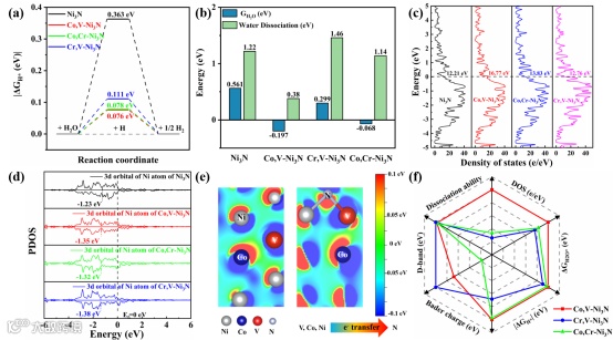对于Co、V-Ni3N,探讨了H* 的s轨道与Ni、Co和V的d轨道的PDOS。H-s/Ni-dxy、H-s/Ni-dyz、H-s/Ni-dx2、H-s/V-dxy、H-s/V-dz2和 H-s/V-dxz的耦合都很强,但 H-s 与 Co-d 的耦合可以忽略不计。考虑到 Ni 原子与 V 原子的比例为 90/5,吸附的 H-s 应主要与 Ni-dxy、Ni-dyz 和 Ni-dx2相互作用,这意味着吸附的H主要在 Ni 位点上。上述轨道分析表明,过渡金属的掺杂调整了催化剂表面的氢吸附位点。