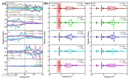 图2. Co,V-Ni3N中不同元素的局部态密度以及分轨道贡献程度。