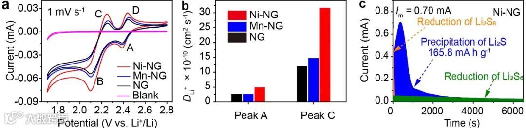 利用三电极测试以及硫化锂沉积测试表征了NG、Mn-NG和Ni-NG对硫物种氧化还原反应的催化作用。实验结果表明,Ni-NG具有最高的氧化还原峰电流、最快的锂离子扩散系数以及最高的硫化锂沉积容量,说明具有最低费米能级的Ni-NG对硫物种的氧化还原具有最好的催化活性。