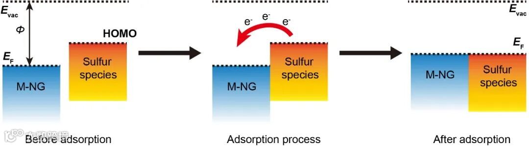 图1. SACs与硫物种接触前后费米能级的变化以及电子转移方向示意图。