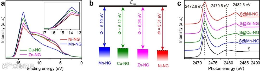 图3.(a-b)Mn-NG、Ni-NG、Cu-NG和Zn-NG的费米能级。(c)S、S@Mn-NG、S@Cu-NG、S@Zn-NG和S@Ni-NG中S的K-edge的XANES谱图。