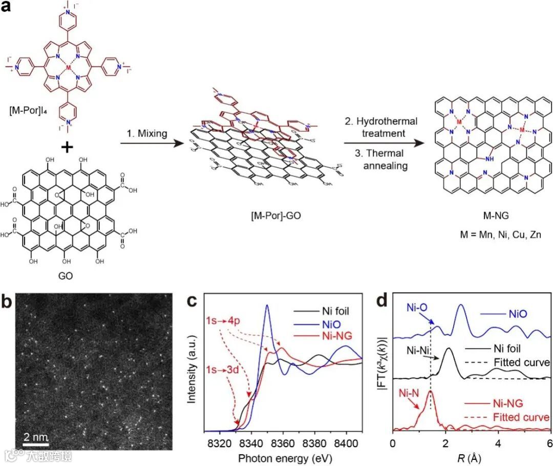 图2. (a)Mn-NG、Ni-NG、Cu-NG和Zn-NG备示意图。(b-d)Ni-NG的AC-STEM和XAFS表征。