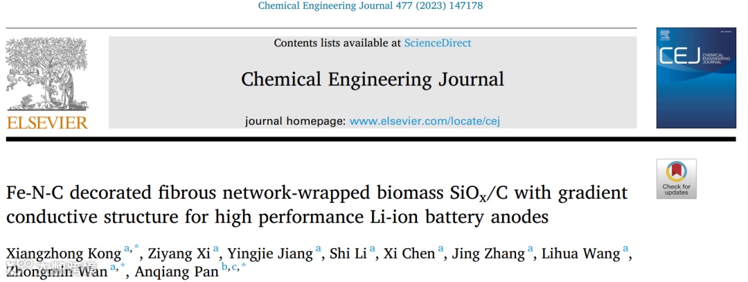 近日,湖南理工学院万忠民教授/孔祥忠副教授团队与中南大学潘安强教授团队合作,在国际知名期刊Chemical Engineering Journal上发表题为“Fe-N-C decorated fibrous network-wrapped biomass SiOx/C with gradient conductive structure for high performance Li-ion battery anodes”的文章。该文章通过一步法镁热还原结合静电纺丝策略,将生物质硅碳(SiOx/C-3)封装入Fe-N-C活性位点修饰的碳纤维网络中(Fe-N-C/SiOx/C-3)中。设计巧妙的间接接触生物质碳/SiO2界面有效地利用了稻壳中的有机成分,并避免了镁热过程中非电化学活性SiC的形成。得益于独特的碳质网络和Fe-N-C的催化效应,Fe-N-C/SiOx/C-3表现出优越的锂存储特性(在0.1 A g-1下循环250圈后,容量为832.6 mAh g-1)。即使在1 A g-1条件下,电极循环1000圈后,容量仍可保持在602 mAh g-1。非原位SEM和XPS测试表明,由内部生物质衍生碳和柔性碳质网络组成的梯度结构增强了复合材料的整体导电性和结构完整性。此外,Fe-N-C的催化作用有助于在充放电过程中快速形成富LiF相的稳定性固体电解质相(SEI)薄膜。组装的LiFePO4‖Fe-N-C/SiOx/C-3 锂离子全电池显示出优异的电化学性能(在0.1A g-1条件下循环100圈后达到106.5 mAh g-1),这为开发高性能生物质衍生硅基负极和提高生物质资源利用价值提供了新思路。