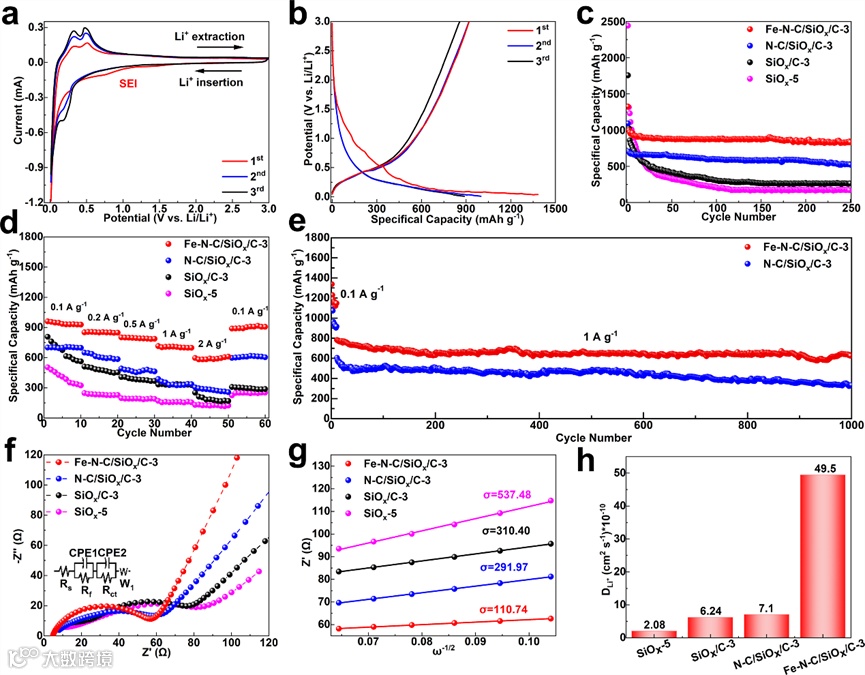 Fe-N-C/SiOx/C-3在0.1 A g-1下循环250圈后,容量为832.6 mAh g-1明显高于其余对比样。在电流密度分别为为0.1、0.2、0.5、1和2 A g-1时,比容量可分别保持在928、850、798、705和606 mAh g-1,当电流密度恢复到0.1 A g-1时,比容量可恢复到908 mAh g-1具有良好的电化学可逆性。在大电流密度1 A g-1下循环1000圈后,容量仍能保持602 mAh g-1,具有良好的电化学稳定性。计算表明,相比于裸硅,Fe-N-C/SiOx/C-3的锂离子扩散系数提高了25倍。