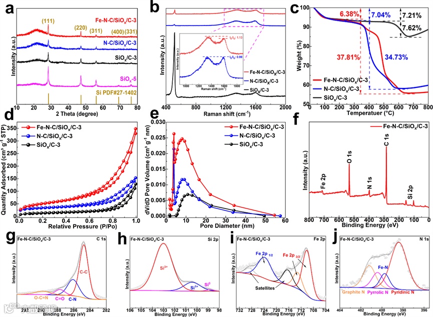 图2. 样品的 (a) XRD谱图;(b)拉曼光谱;(c) 热重分析;(d) 氮气吸附-解吸等温线;(e) BJH孔分布曲线;(f-j) Fe-N-C/SiOx/C-3的C-1s、Si-2p、Fe-2p和N-1s光谱。