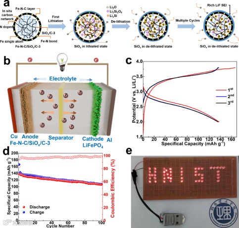 图4. (a) Fe-N-C/SiOx/C-3的锂化/脱锂化机理;(b) LiFePO4‖Fe-N-C/SiOx/C-3全电池示意图;(c) 恒流充放电曲线;(d) LiFePO4‖Fe-N-C/SiOx/C-3全电池在0.1 A g-1下的循环性能;(e) 照亮以HNIST阵列的全电池照片。